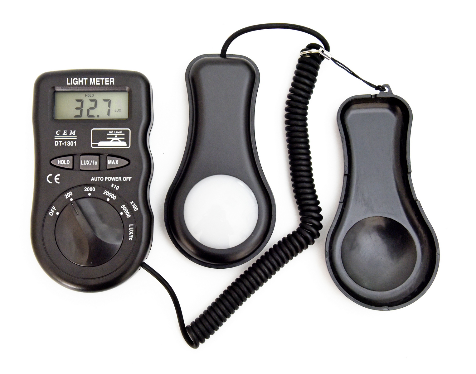 Портативный люксметр DT-1301 предназначен для быстрого и мобильного измерения уровня освещенности. С его помощью вы сможете решить множество задач, от проверки освещенности учебных заведений или производственных помещений до измерения световых характеристик теплиц или промышленных объектов. Этот люксметр имеет современный компактный и эргономичный дизайн, и состоит из самого блока с экраном и выносного фотодетектора (силиконовый фотодиод с фильтром).