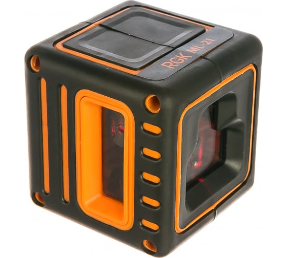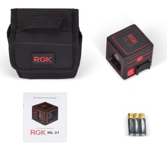 Корпус покрыт мягким прорезиненным пластиком, предохраняющим уровень RGK ML-21 от случайных ударов и падений с высоты до 1 метра. Питание осуществляется тремя батареями типа ААА, батарейный отсек находится на задней стороне прибора. Непрерывное время работы достигает 8 часов.